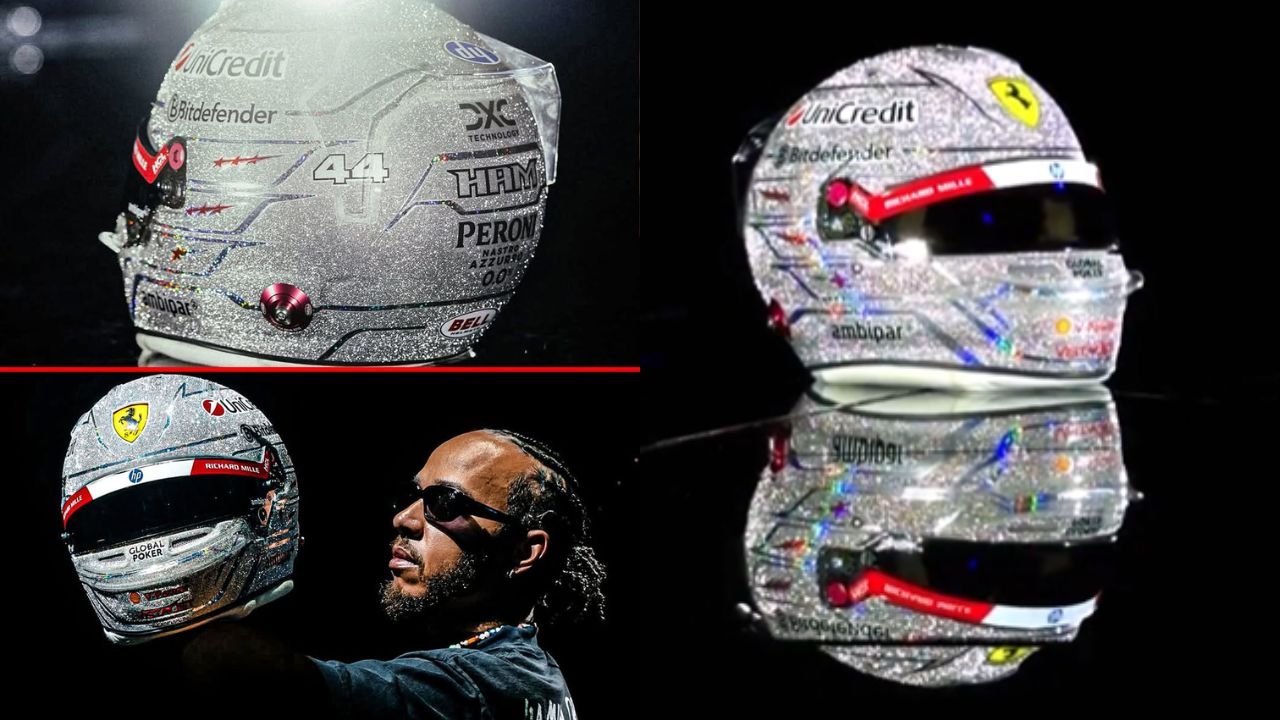 Helm ini meninggalkan kombinasi kuning-merah khas Ferrari dan memilih desain serba perak dengan lapisan glitter yang memantulkan cahaya neon Strip, menghadirkan efek “berdebu berlian” yang mencolok.